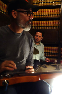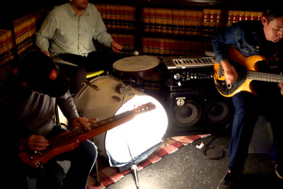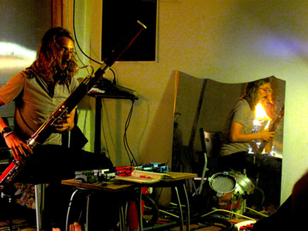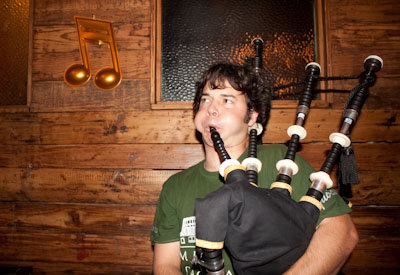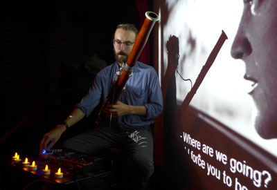 David Duncan on bagpipes and Archie Carey and drone whale setting up for Stupid Pills: Aurgasm #1 - The Attack of the Drones, video 2. |