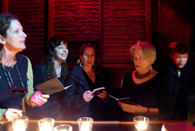 ![]() Members of Nevenka, Jessica Ng, Ronda Berkley, Terri Prizant, Leslie Yeseta, Anna Cross, Rebecca Stout, Susan North, and Liseli Walan (not in order), singing to a slide show of Spomenik by Jan Kempenaers. |