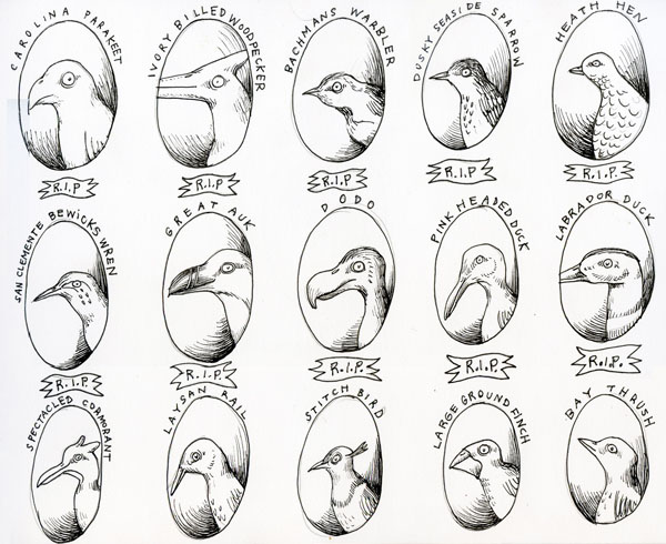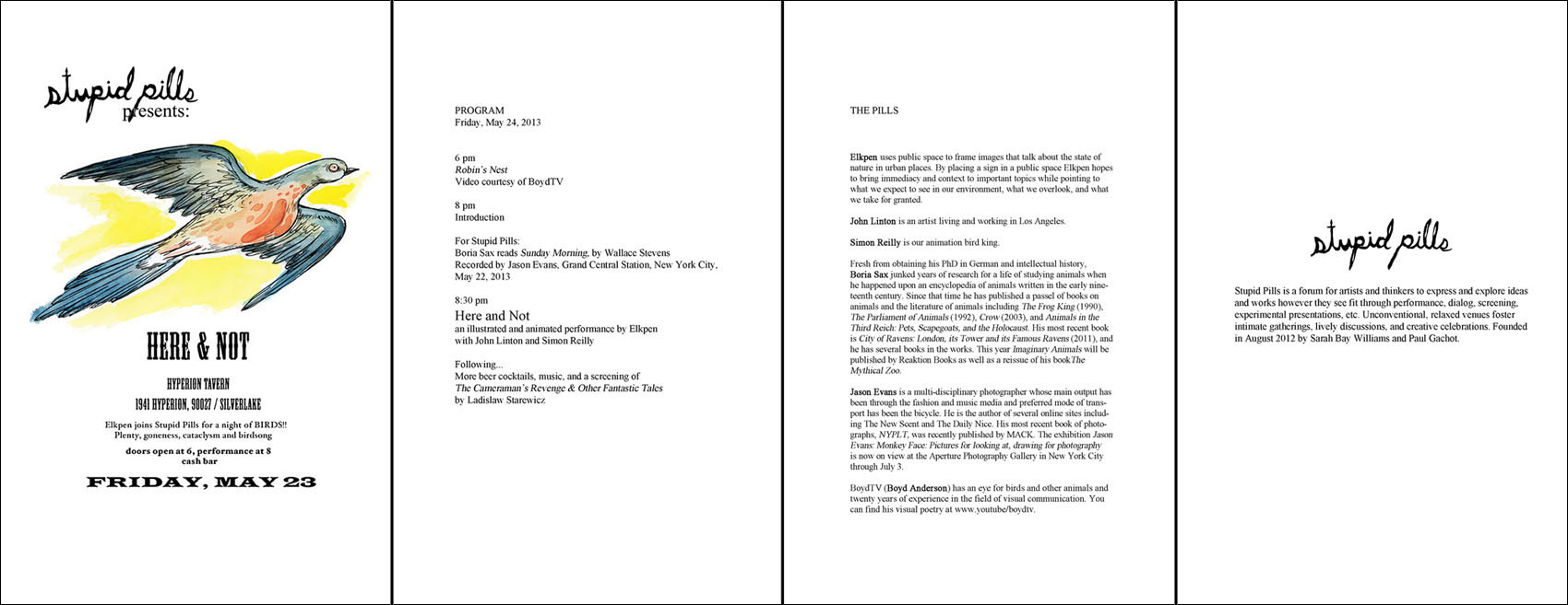 HERE AND NOT All of these species of birds (and many more) have gone extinct. Let's consider one of them. Over the course of a century the population of passenger pigeons in the United States went from billions to just one, named Martha, who lived in the Cincinnati Zoo. She died in 1914. Human impact on the world's life forms and ecosystems is probably here to stay (at least until we're gone). Some scientists proclaim this the beginning of the Anthropocene Era—a time in which evolution responds more to technology and hubris than natural selection. Who's footing the bill for our experiment? Join us for a freestyle elkalogue on extinction, plenty, gone-ness, eating and being eaten, time, serendipity, cataclysm, unintended consequences, progress, and the shifting silicones of evolution. "Here and Not" will recount the plight of the passenger pigeon with illustration, animation, and music. With an opening number by Stupid Pills. About Elkpen Elkpen uses public space to frame images that talk about the state of nature in urban places. By placing a sign in a public space Elkpen hopes to bring immediacy and context to important topics while pointing to what we expect to see in our environment, what we overlook, and what we take for granted. |