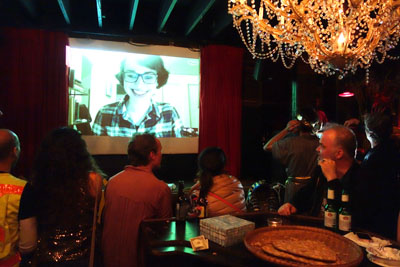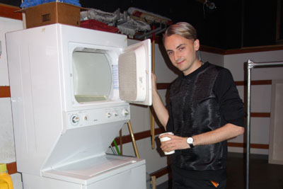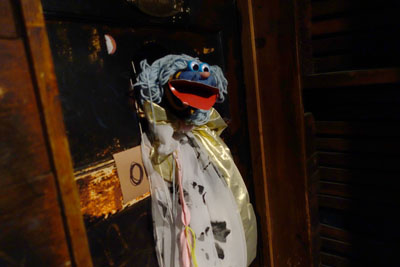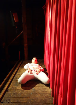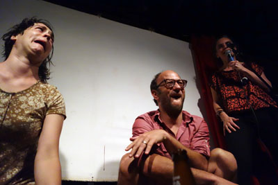 ![]() David Gilbert as drag puppets Mona Gemini and her sister, the poet Lisa Gemini, through a hole in the mens' room door. |