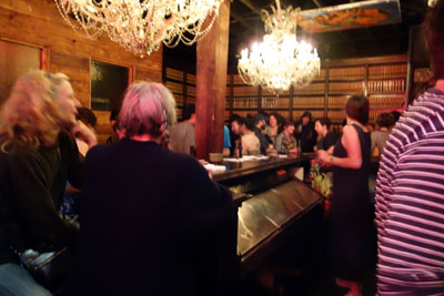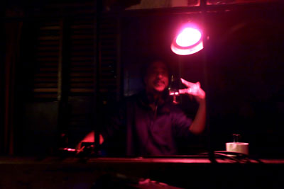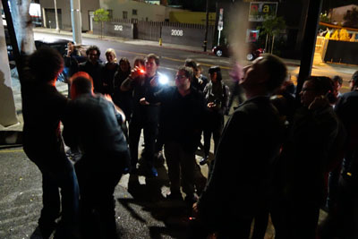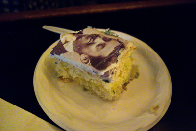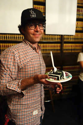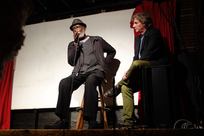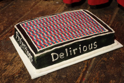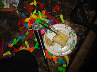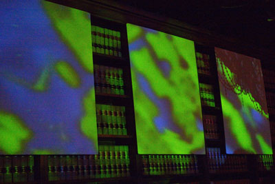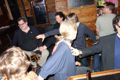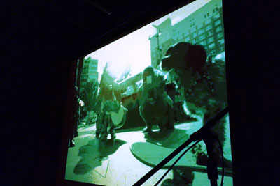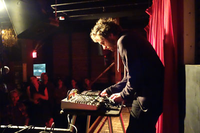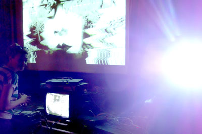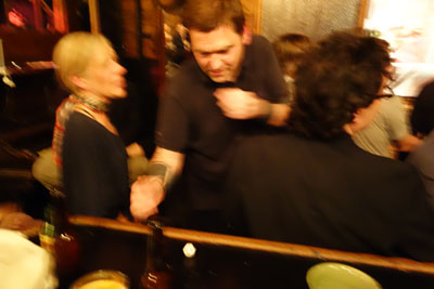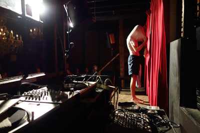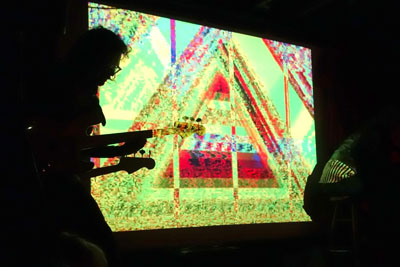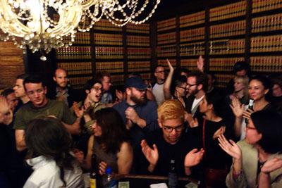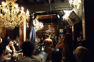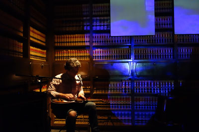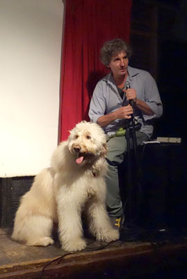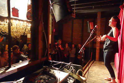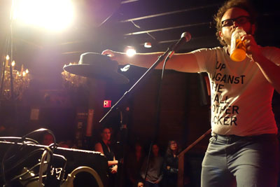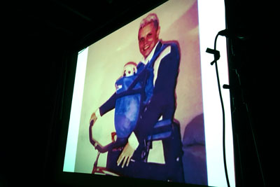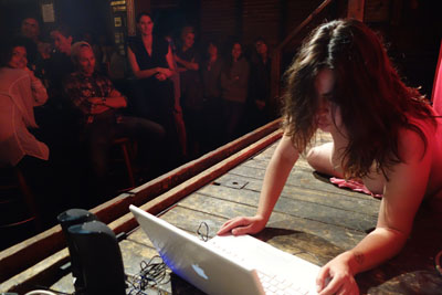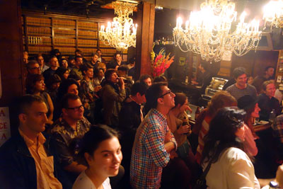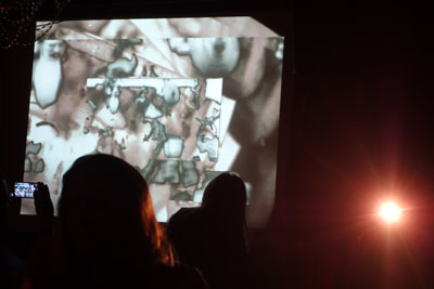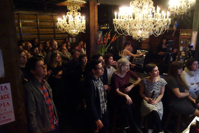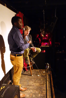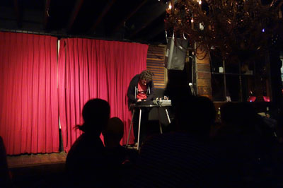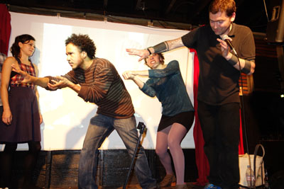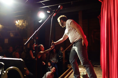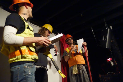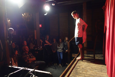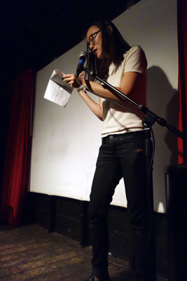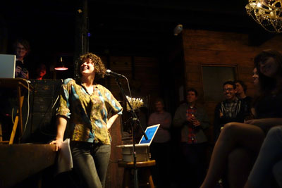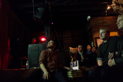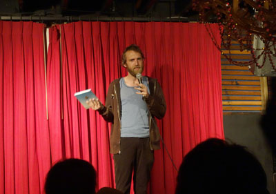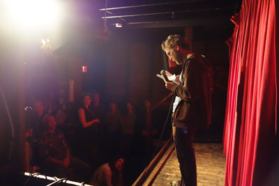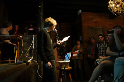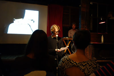 ![]() Cameron Crone, reading his artist's statement backwards, which was recorded and played in reverse later in the evening. |