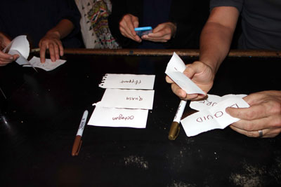 Another exercise: write down a verb, a noun, and an adjective and put them in separate bags. Mix them up and then select words from the bags. |