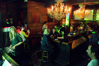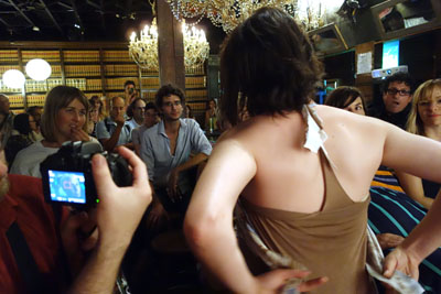 According to each roll, each person in the bar would touch the person next to them on a particular body part. |