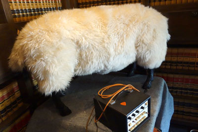 ![]() John Geary performs in front of his installation, the "Push-me, Push-ewe." |