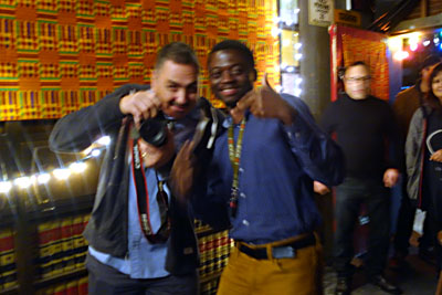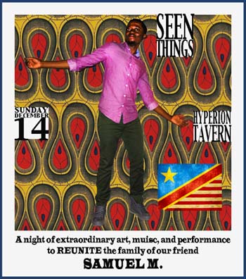 Sunday, December 14, 2014 at the Hyperion Tavern, 1941 Hyperion Avenue, LA CA 90027 Doors at 6:00, performances at 7:30. We raised over $4000 from the donors for this event - THANK YOU!!!!! A note from Samuel: Thank you everyone for your contribution and for coming to the event last night. It was great to meet all of you guys. My wife, Justine, asked me to thanks you for all the kindness. As Pie Tshibanda, a popular Congolese writer said, "Laisseront nous peu d'espace sur notres table pour l'etranger lorsqu'il viendra? Trouvera-t-il peu d'espace et d'amitie? Ne laissons pas mourrir la terre." I can say yes, you all have given me a space at your table, and I hope we going to meet soon when my family will come. We will celebrate together! I'm especially want to thank my friends Mark Murphy, Neil Abramson, Paul Gachot, and the amazing "Mama Sarah" Bay Williams for everything! The fundraising will continue until we have paid for Samuel's legal fees for asylum, other government fees, and plane tickets to reunite his family.(See The Facts, The Plan, and Backstory below) Please DONATE and thank you for joining us on December 14! Music and performances by: LA FOGPRISM PIPE MC HYMNAL DAVE RALICKE DODO MUNOKO EARTH LIKE PLANETS KAOS / BEN CALDWELL Door prizes: OTHERWILDPIÑATA LAB COOKBOOK CAKE AND ART LAURA CHERRY SILVERLAKE WINE MOHAWK GENERAL STORE CHEESE STORE OF SILVERLAKE As well as an opportunity to take a photo with INSTAGRAM STAR MR. SNEAKY! AND MORE! Congratulations to our door-prize winners! ENJOY! |
